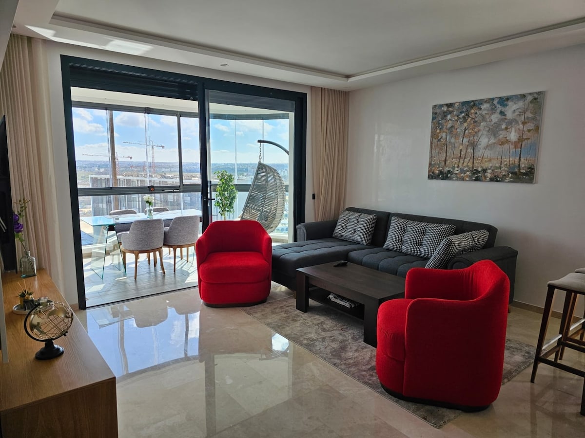 Enjoy a comfortable and stylish stay in the heart of Casablanca Finance City (CFC). This modern one-bed apartment offers beautiful open views, plenty of natural light, and a calm atmosphere above the city The apartment features a spacious bedroom with a comfortable bed and quality linens, a bright living area perfect for relaxing or working, and a fully equipped kitchen for short or extended stays. Large windows showcase panoramic city views, making mornings and evenings especially enjoyable