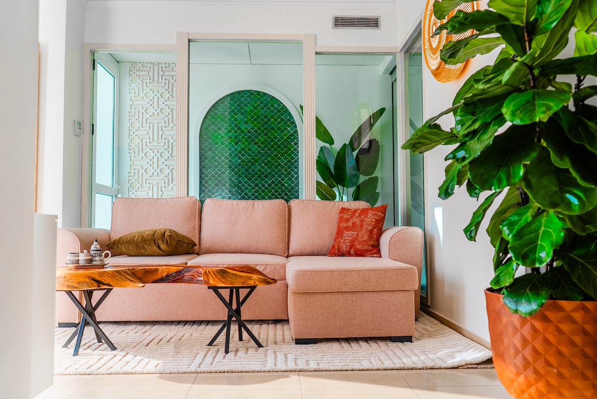 Il y a des appartements où l'on pose les valises. Et d'autres où l'on pose l'âme. La pépite de Gauthier est le second. Niché au cœur de Casablanca dans le quartier le plus vivant de la ville — cet appartement a été conçu comme un objet de désir : arche en zellige vert émeraude, table basse en bois massif brut, poteries artisanales, canapé Beige rose poudré, et cette lumière qui traverse tout. Le Maroc que vous rêvez, version design contemporain. Boulevard Zerktouni, à deux pas des Twin Towers.