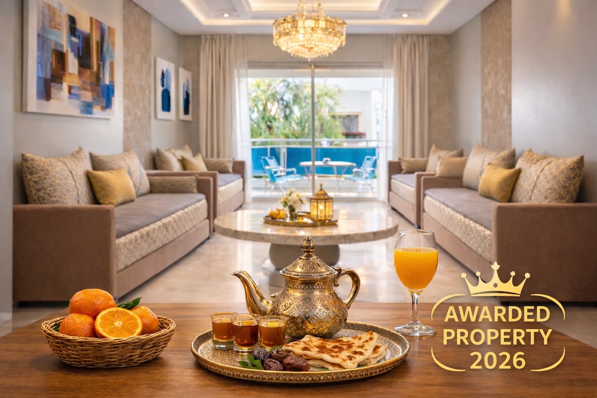 An apartment of 93 square meters located just 8 minutes away from Mohammed V Airport. It features 3 bedrooms, 2 bathrooms, and a fully equipped kitchen. Transportation to and from the airport is available, as well as the option to enjoy a traditional Moroccan breakfast upon request.