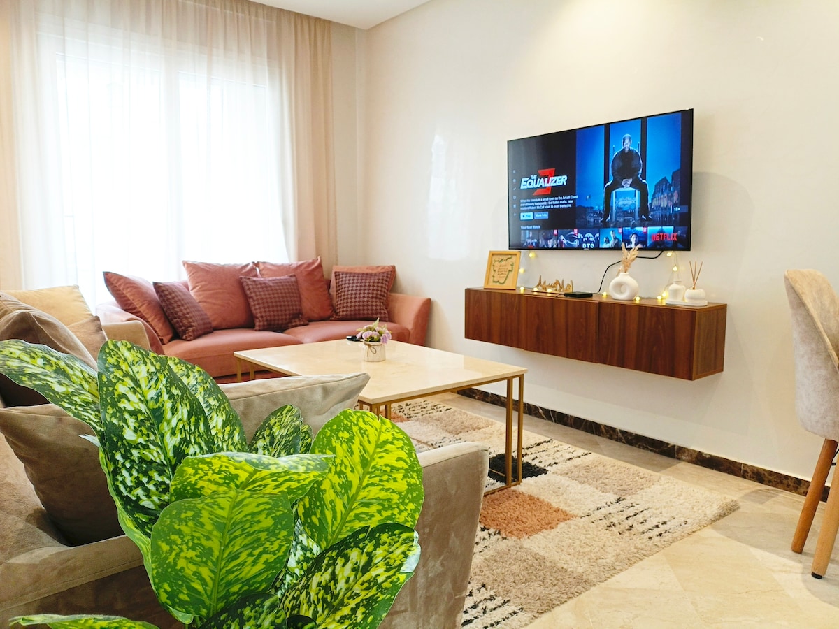 ✨ Elegant retreat in the heart of Casablanca, right across from Casa Port train station. This bright and spacious 83m² apartment offers all the comfort you need for a perfect stay and can comfortably accommodate up to 5 guests. It features 2 peaceful bedrooms with garden views, a home cinema-style living room (75" TV), a balcony overlooking the Hassan II Mosque, a fully equipped kitchen, and a dedicated workspace. Perfect for relaxing moments, whether for a weekend or an extended stay 🌇🌿