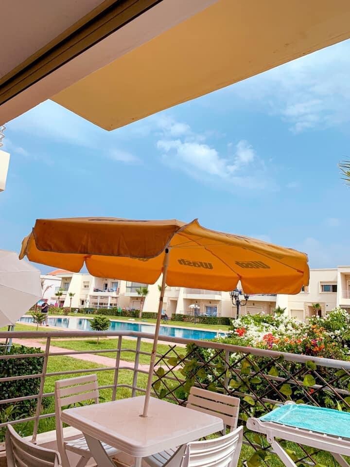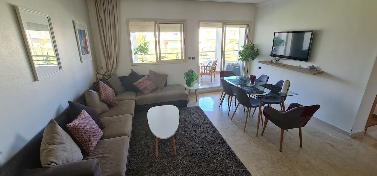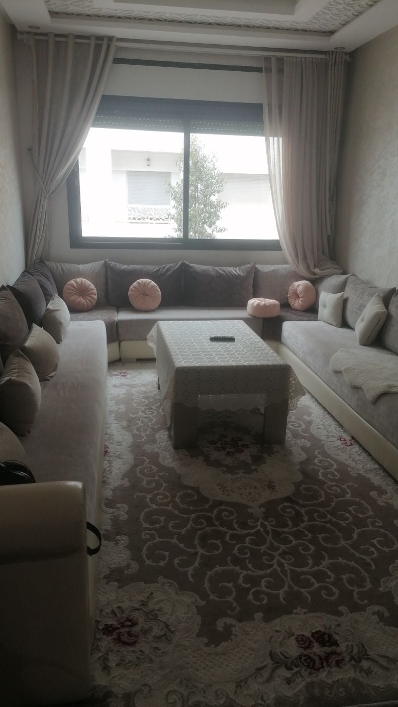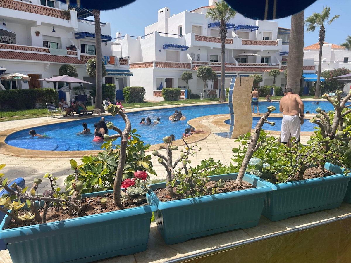Bonjour, Je mets en location un appartement de 90m². L'appartement est situé dans la résidence Marbella Beach à Mansouria. L'appart est meublé,ensoleillé, propre avec 2 chambres en lits double+grand salon avec TV et salle à manger + cuisine équipée + 2 salles d'eau + deux balcons (vue sur mer et vue sur piscine). La résidence est sécurisée + Piscines + Air de jeu + Super marché. A 10 min en voiture des plages Mimoza, David et 25 min de Daomé, Bouznika Idéal pour une famille entre 5 et 7 pers.