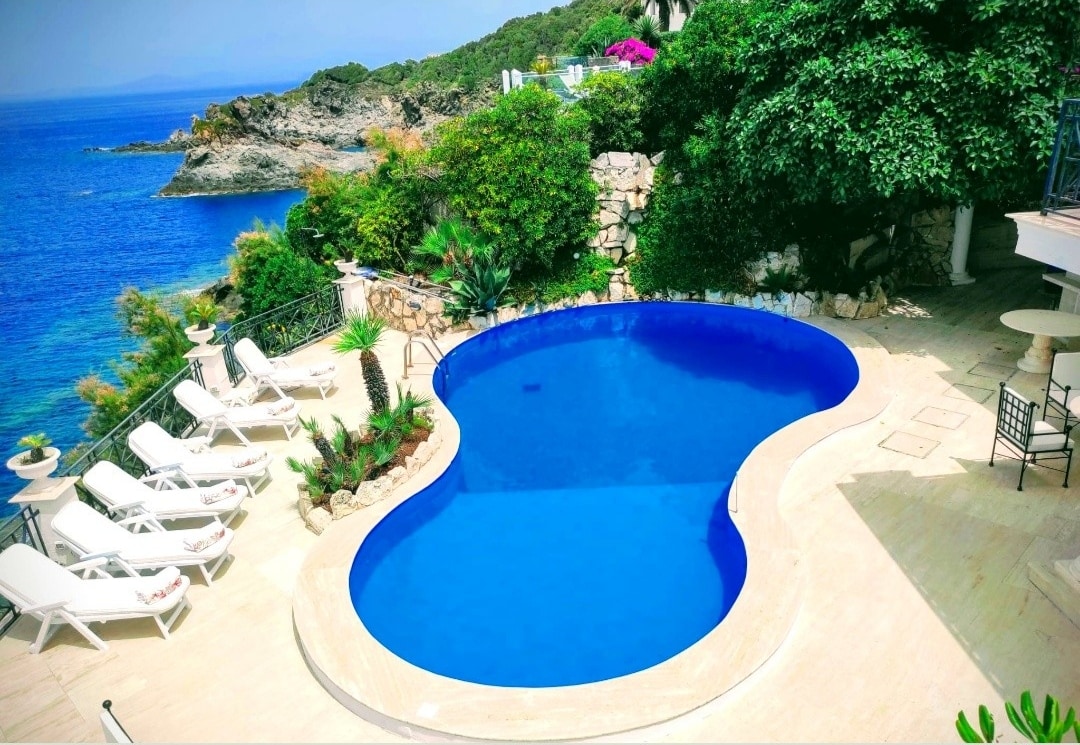 Una piscina termale, una sauna naturale. Una villa esclusiva immersa in un rigoglioso giardino, sospesa tra cielo e mare. Nell'incanto della Baia di Citara una delle più suggestive dell'isola perché esposta interamente ad Ovest: tramonti da sogno col sole rosso che si va spegnendo nel mare aperto dietro l'isola di Ventotene, unico ostacolo allo sguardo spalancato sull'orizzonte immenso. Sei camere da letto doppie, fresche, panoramiche ognuna con suo bagno, ventilatori e mini frigo.