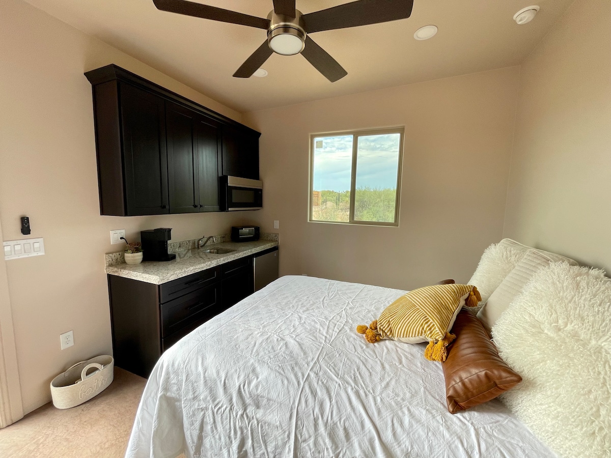 Here at the Double H Hacienda you will find a cozy and charming detached guest house with private entrances, plenty of parking (covered available). Plenty of natural light and a design that is all its own - where modern farmhouse meets the desert. It comes stocked with all the amenities you could desire including in-unit laundry and kitchen. Beautiful 360 degree views of the mountains and Tucson's breathtaking sunsets from anywhere on the property. Equine Experiences available for all guests!