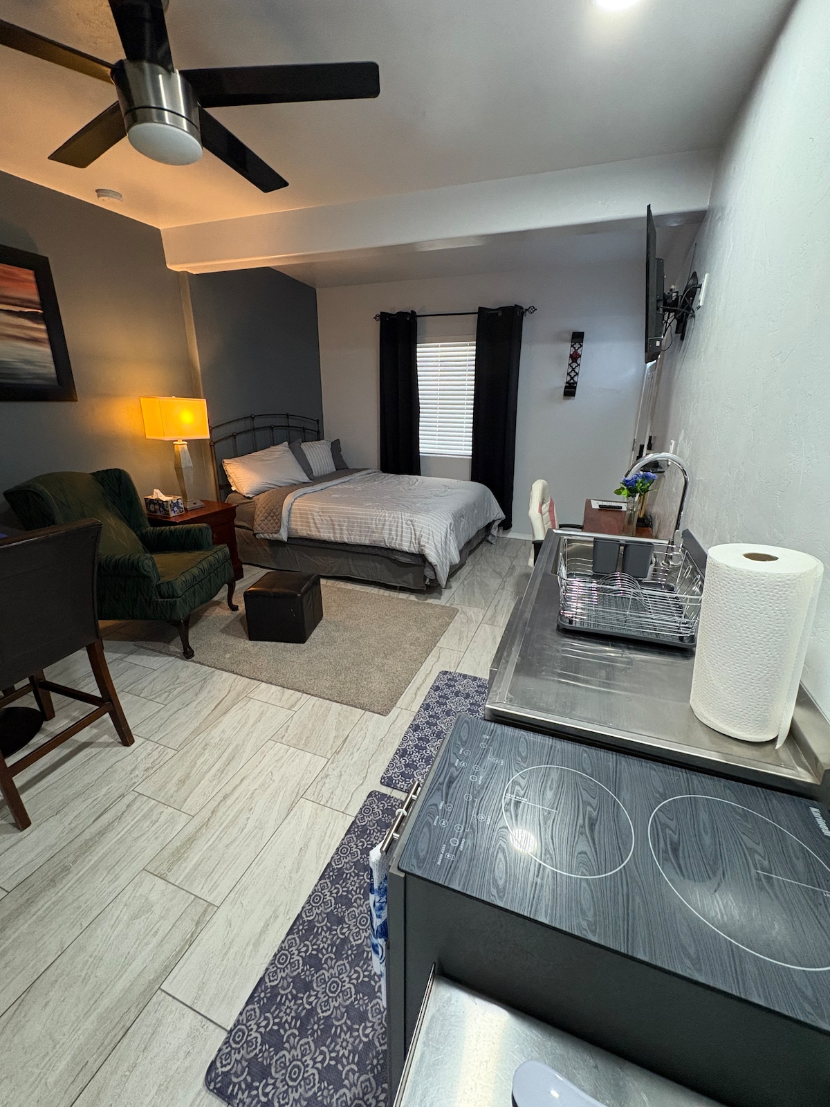 Looking for long term? PRIVATE ENTRANCE Peaceful private suite is a wonderful oasis on the edge of the desert, quiet and serene. 5 minutes to 1-10, and Tumamoc hiking, 10 minutes to U of A, & downtown. Fully equipt kitchenette, spacious full bath, and large bedroom. Remodeled in 2018 with new "everything" queen bed, 43"4K HDTV, large closet. Desert landscaped yard features mountain, city views, and patios. Very quiet neighborhood. A favorite stay for long and short term guests!