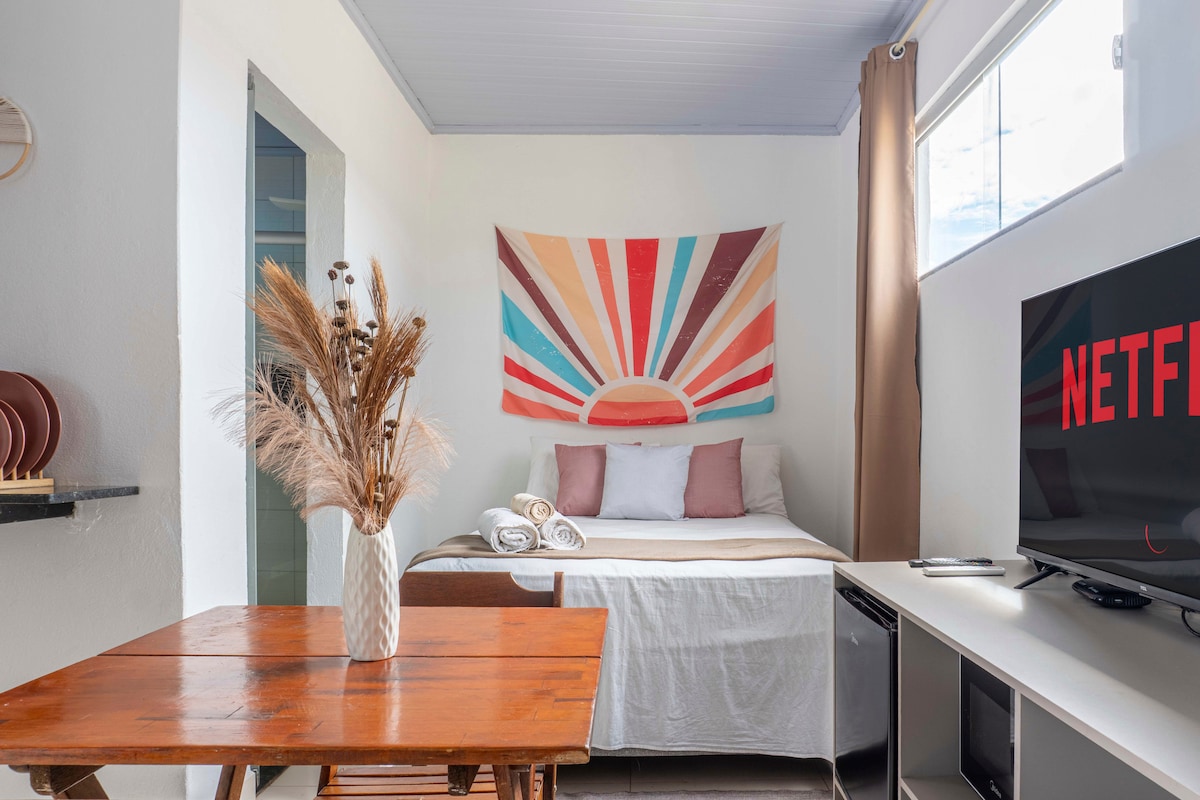 Super charming house and very central, in the middle of nature :) Rustic and comfortable, draws attention for its ceramic details and distinct materials, with a touch of natural and contemporary creativity. A colorful environment to rejuvenate your spirit and soul, with the advantage of being right in the center and doing everything on foot. • Double bedroom and double sofa bed in living room • Full kitchen and WiFi; • Nature and tranquility; • 100m main street; kisses, Dana