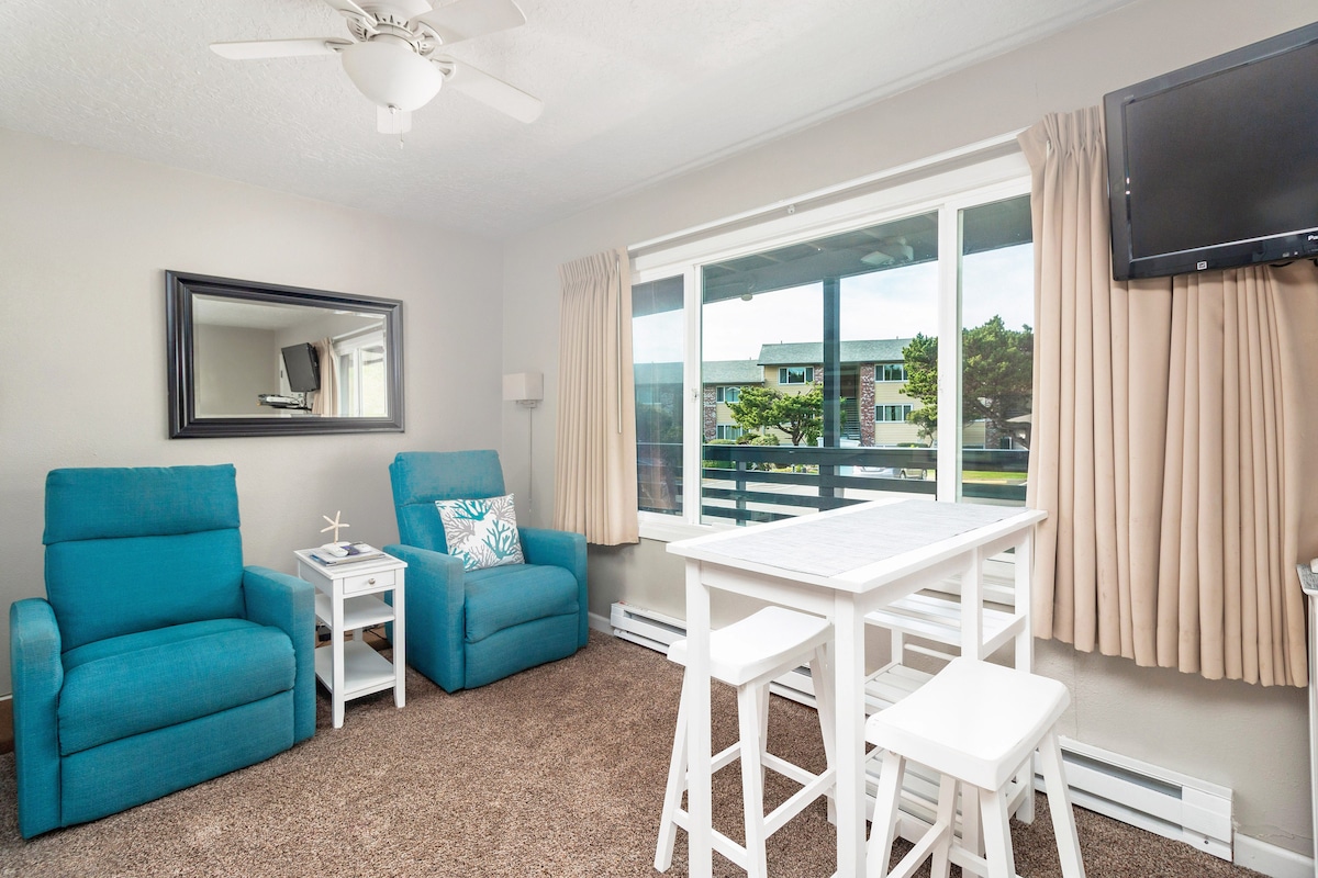 Ocean Terrace Condominiums sits at the edge of the beach on the Oregon Coast! All of our oceanside suites are individually owned and uniquely decorated, and feature fully-equipped kitchens and a separate bedroom. Suite #30 is on the 3rd floor of the oceanfront building; it has a balcony and a panoramic view of the ocean and beach through the sliding glass doors. There's a king-size bed in the bedroom, and a sofa bed in the living room.
