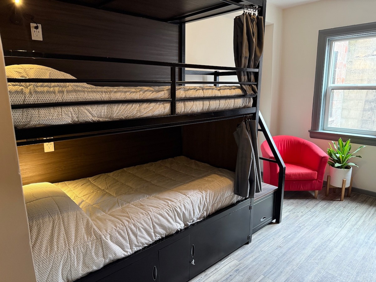 Enjoy the glamour of this stylish, upscale place. Traveling with friends or flying solo? Our 4-Person Shared Rooms offer the perfect blend of comfort, convenience, and community. Each key card-accessed room features two sets of our premium, ultra-comfy bunk beds—complete with privacy curtains, personal reading lights, power outlets, and secure lockers underneath for your belongings. Say goodbye to wobbly ladders—our easy-access stairs to the top bunks make getting in and out a breeze.