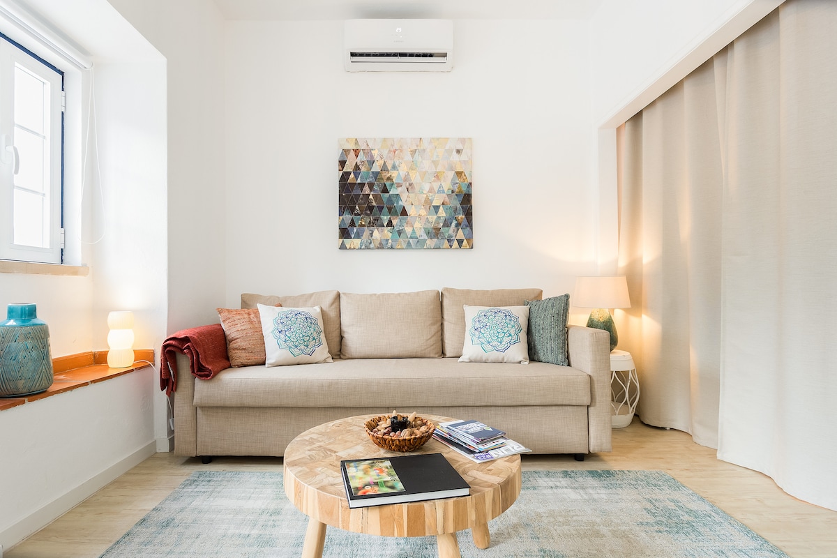 This Guest House located on the outskirts of Cascais Center, within walking distance to many restaurants, cafés, museums, beaches and a short 35-minute train ride to the center of Lisbon. Open-plan space, with a meter tall wood divider separating the living area with kitchenette from the bedroom, walls and closet covered in natural jute wallpaper, white marble bathroom with steam shower cabin. Our Guests are welcome to use the heated plunge pool at 32ºC all year round.