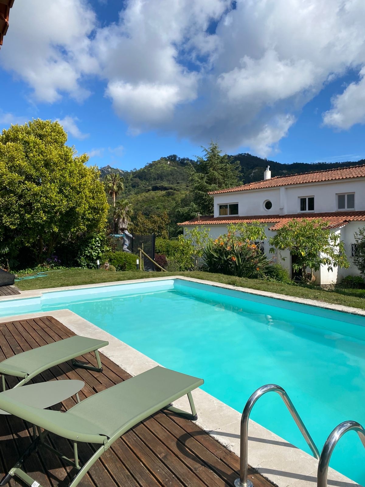 Villa pour 10-12 p, quartier résidentiel, proche parc forestier régional pour belles balades et à 3.5 km de très belles plages, 5 chambres, 4 sdb, jardin, piscine privée (13 x 6m), grande salle de jeux (billard, baby-foot), 2 barbecues, golf (3 km), 25 km de Lisbonne & aéroport. Grande cuisine & terrasse. Verger derrière l’annexe Parking privé. Si séjour de + de 7 j: frais ménage facturés par semaine