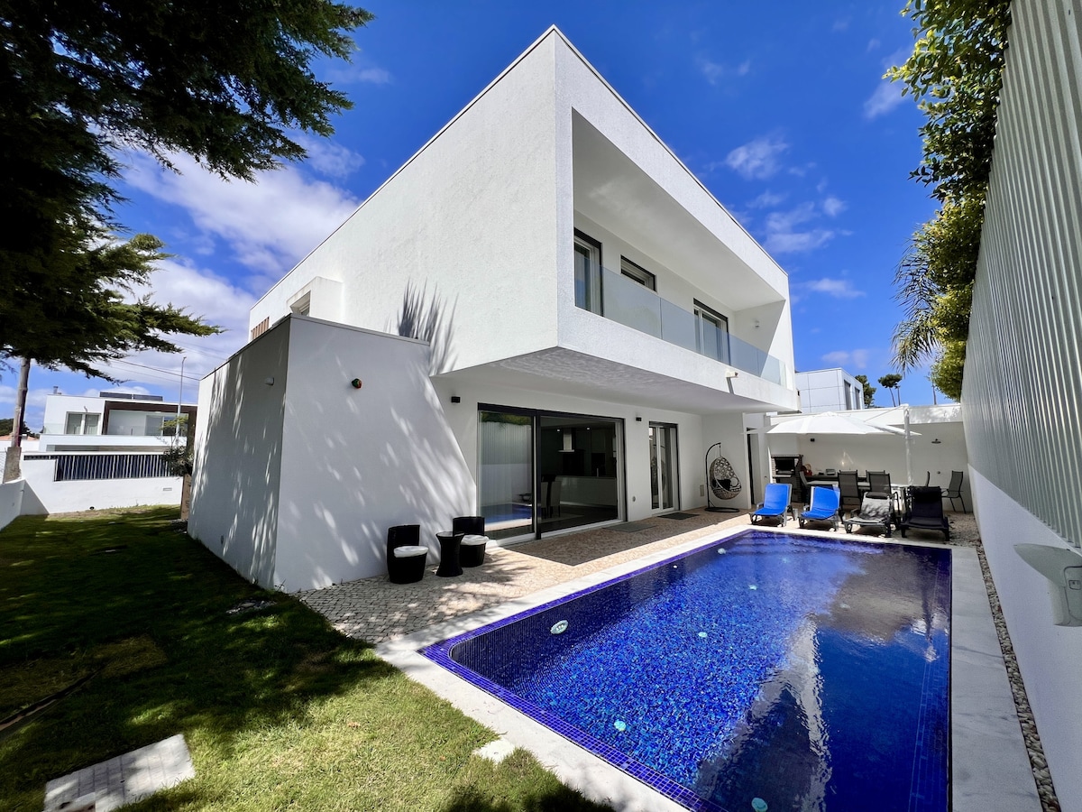 Bord de mer. Luxueuse Villa de style balinais pour 8 personnes avec piscine chauffée (option à 25 euros par jour). 200 m2 dans un quartier calme. A 6 minutes des plages de Fonte da Telha (en voiture). 2mn du golf Lisbonne Aroeira. 35 mn de l’aéroport. 5 mn du supermarché. 4 chambres (dont une suite) avec TV NETFLIX. 5 lits+lits bébé Climatisation chambres et salon. 3 salles de bain. WIFI rapide. TV géante (75p) avec home cinéma dans le salon. 2ème salon avec grande TV. BBQ.Table de Ping pong