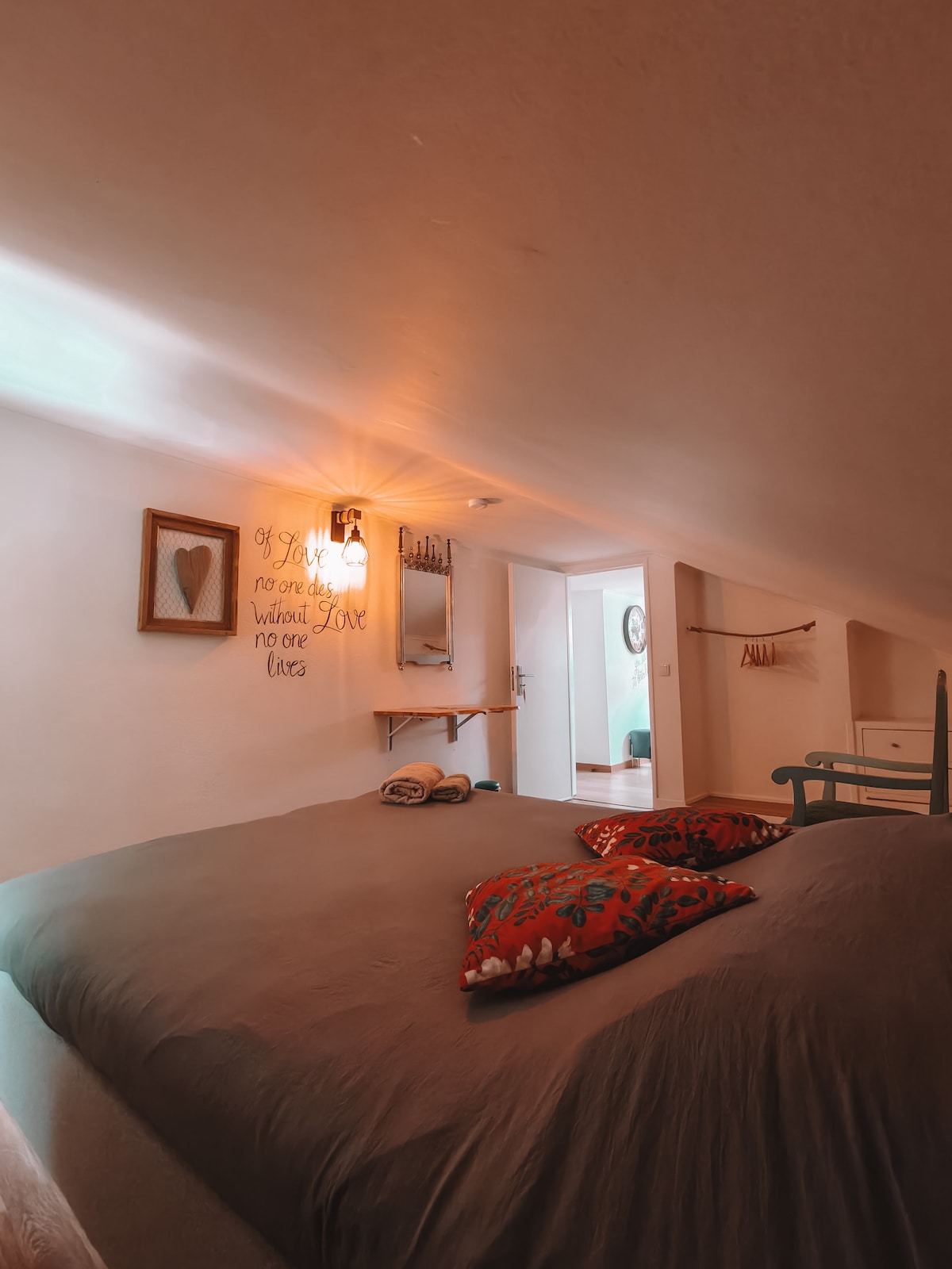 Ours is a quiet home, filled with sunlight and charisma. We have 3 guest rooms in the house - This room is on the ground floor facing a front yard with a chill-out deck. The room has a private WC and a big bed that can be modified into 2 single beds. Breakfast can be provided for an additional 8€ /person/day - croissants or cake, bread, butter, cheese, jam, fresh fruit, juice, tea, coffee and milk or hot chocolate. Our pets are friendly and the house has a chilled vibe. Enjoy your stay!