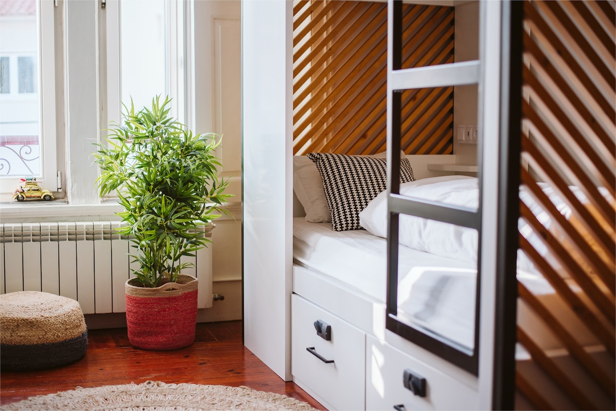 Eco Ljmonade Hostel is located in the heart of Cascais. We offer affordable accommodations in an eco-friendly atmosphere. Our spacious 4-person en-suite room features one double bed and one bunk bed, along with a private bathroom. The hostel is just a 10-minute walk from the train station, supermarkets, beaches, and the vibrant nightlife of Cascais. You’ll love our comfy beds! We welcome couples, solo adventurers, business travelers, families, and groups at our hostel! No pets allowed.