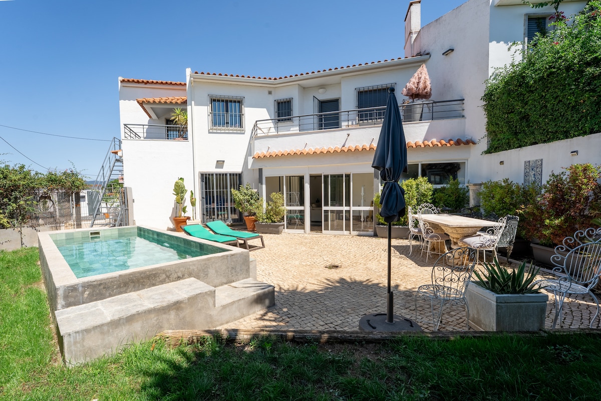 New Pool with cover and saline water (3,5M * 7 meters ) Our house is completely renovated with new furniture in a modern vintage style. The house is surrounded by a beautiful garden with many different areas including eating area with Grill & garden furniture. 4 comfy rooms in total 3 with balconies, 3 wc, and one terrace of 30m2 prepared for sun-bathing, garage. You have shops, rest, and bus stop less then 5 m walking distance. Train to connect you with Lisbon and Cascais is 1200 m away.