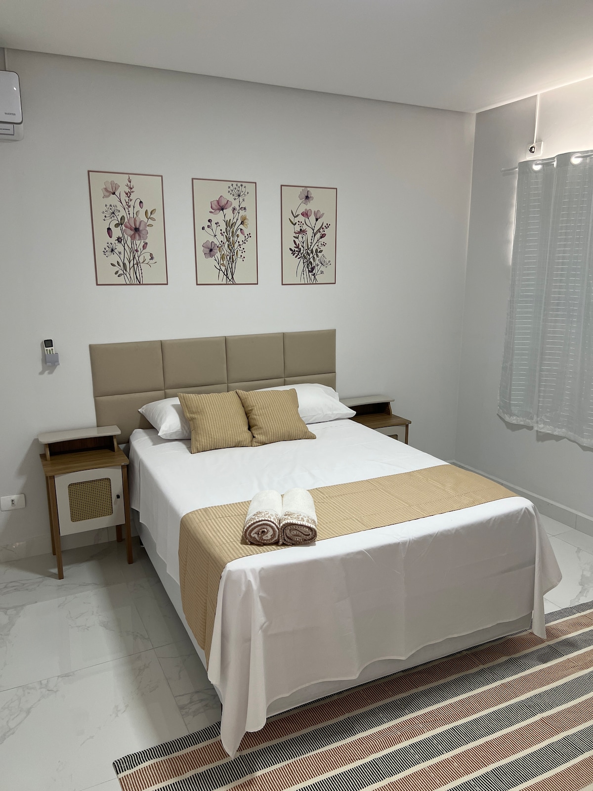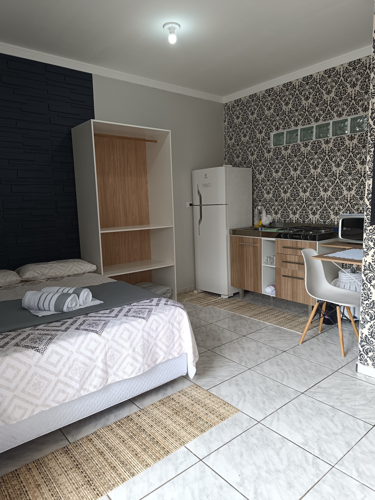Quarto para duas pessoas com: -Ar condicionado frio; -TV slim com acesso a Internet; -Banheiro com chuveiro quente; -Mesa com duas cadeira; -Cozinha equipada com panelas, talheres, fogão, pano e etc; -Garagem coberta e acesso com controle; -Frigo bar; -Prédio com apenas um ano de construção; *Mercado - 650m *Farmacia - 550m *Padaria - 500m *Shopping - 1,7km.