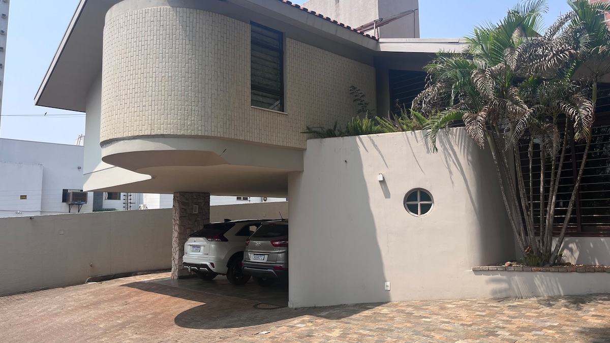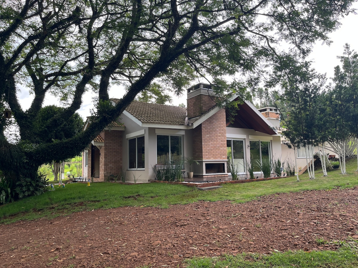 Incredible accommodation, 3 large and comfortable suites in a beautiful triplex; wooded neighborhood with walking park. You will wake up to birdsong and a beautiful view of the riparian forest of the municipal lake. Easy access to restaurants, supermarkets, shopping malls, the center and BR 277, you can choose by car, bus, Uber or on foot. There are 750m² and a garage for 10 cars. Integrated swimming pool and common area. Full kitchen with barbecue and utensils. Small breakfast can be arranged.