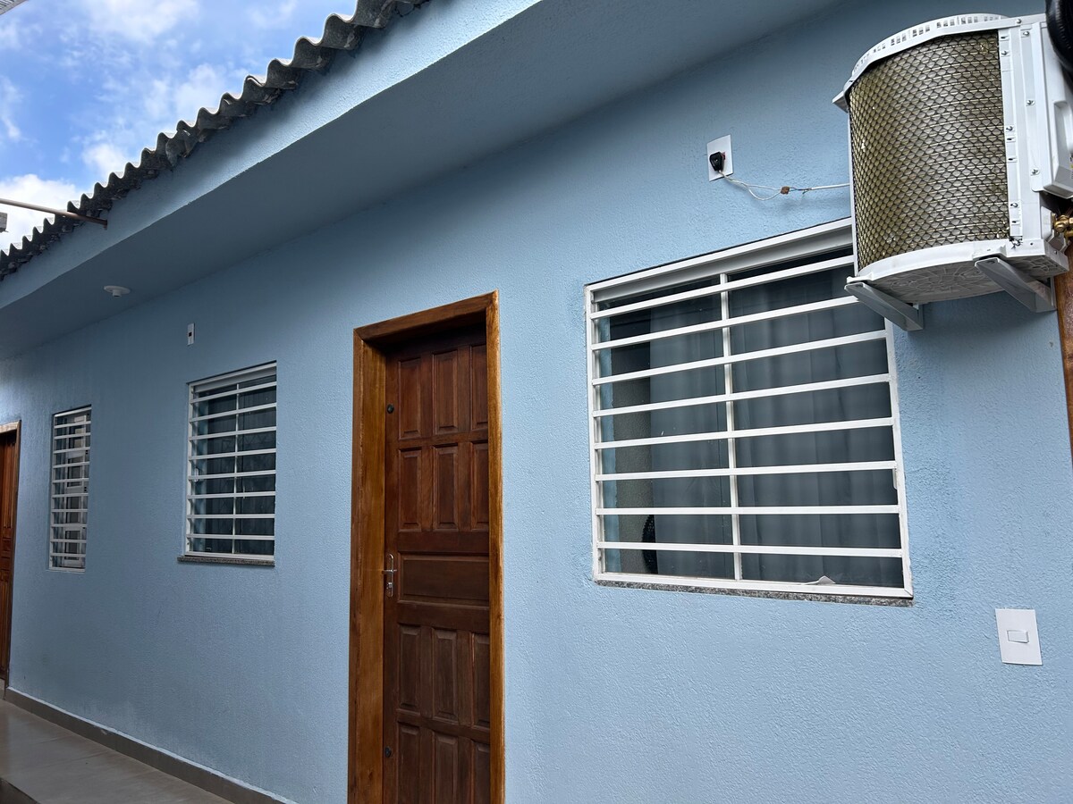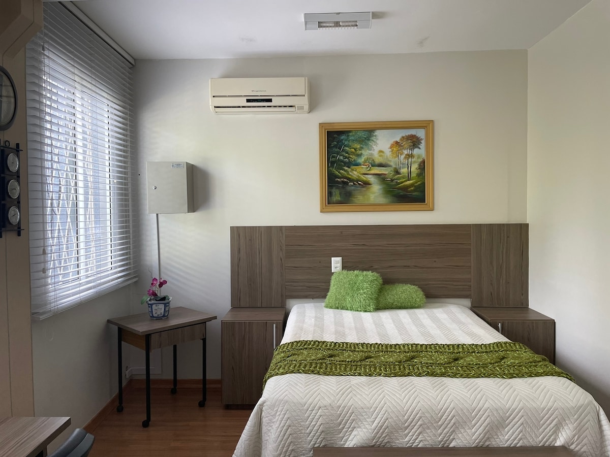 Relaxe neste espaço calmo e cheio de estilo. O flat é um espaço ótimo para casal com filhos, pessoas que vem a trabalho/estudo. Fica ao lado da minha casa, vamos compartilhar o portão de entrada porém, seu espaço é privado. Tem um bom chuveiro, cama confortável. Embaixo temos 3 gatinhos que ficam pelo pátio. OBS: A GARAGEM é no terreno vizinho. Ar condicionado quente e frio.