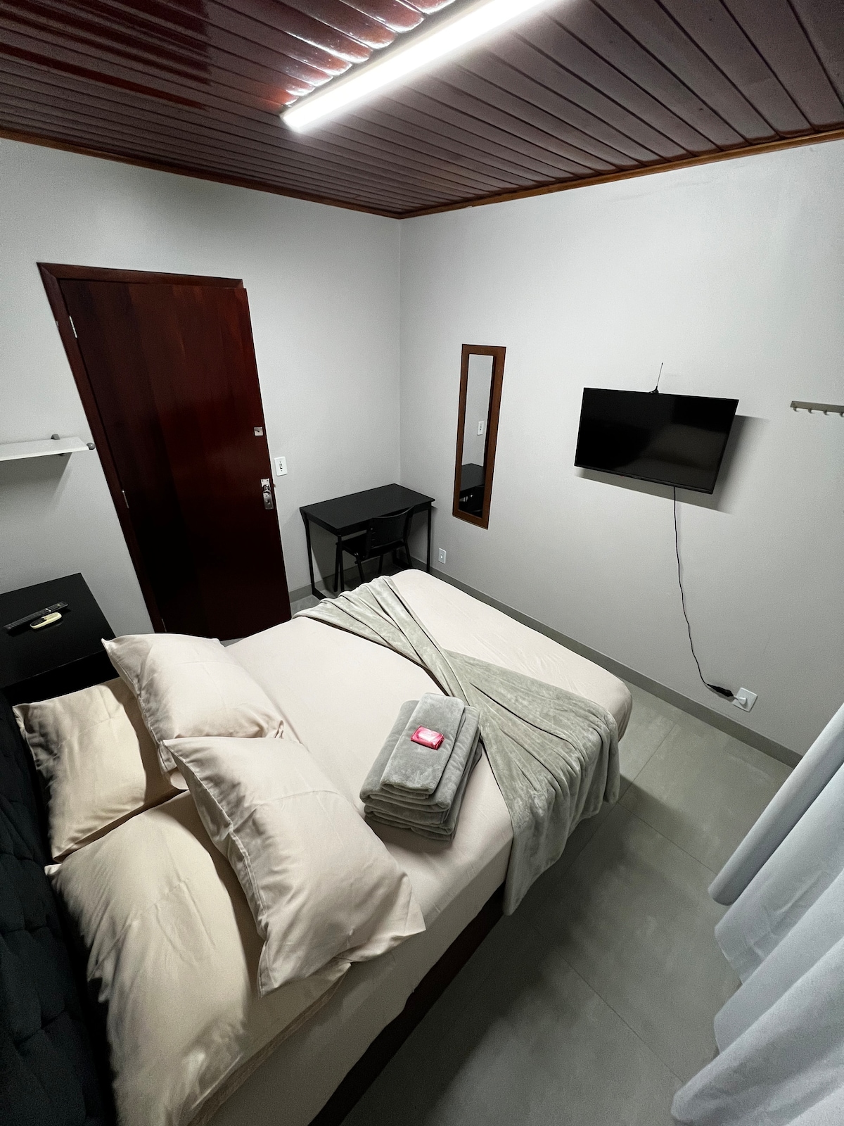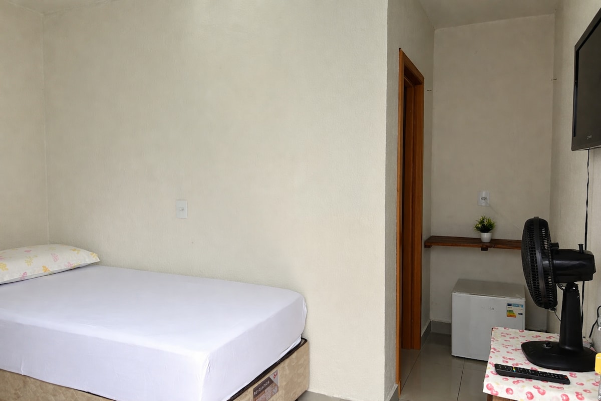 Mini suíte com acesso privativo. Ideal para uma pessoa (cama de solteiro). Mas podemos fornecer colchão extra, se solicitado para dois hóspedes. Cada mini suite tem tv, banheiro e frigobar. Caso queira preparar um café ou lanche, disponibilizamos uma copa compartilhada com pia, cafeteira, sanduicheira e microondas.