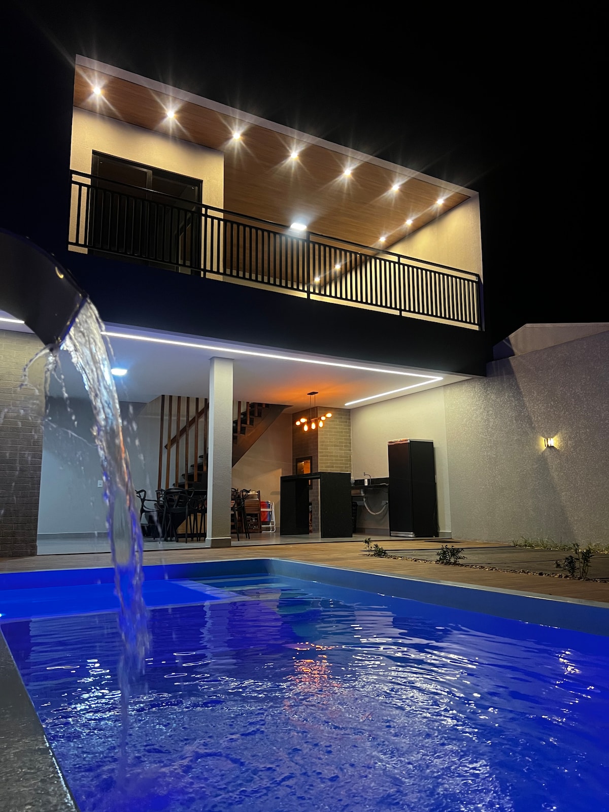 Casa TOP na região Central/Bairro Neva, próxima ao Muffatão, farmácias, conveniências, restaurantes, pet shop. Ampla área de lazer com churrasqueira e forno a lenha. Quintal com piscina aquecida de 7x3 c/ 4 pontos de hidromassagem, umbrelone, espreguiçadeiras e chess. 1 quarto com ar condicionado, televisão, mesa de trabalho e bwc, 1 suíte c/ bicama e berço. Sala e cozinha conjugados com ar condicionado e sofá. Wi-Fi. Espaço para até 4 carros. Possibilidade de late checkout. Espaço exclusivo.