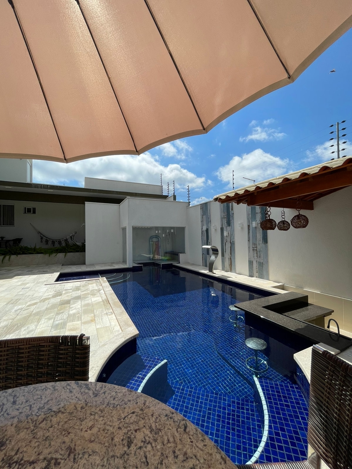 Sobrado medindo 290m, cômodos amplos todos mobiliados! Área gourmet e piscina! Espaço total 490m Portão eletrônico, cerca elétrica e câmeras de monitoramento! Contendo 6 suítes, 5 com ar condicionado e 1 sem ar-condicionado 2 camas box king 2 camas box queen 2 cama box casal 2 colchões de solteiro Cozinha mobiliada e com utensílios domésticos Sala de jantar 2 salas de TV Edícula com área gourmet, suite e banheiro Piscina com aquecimento solar