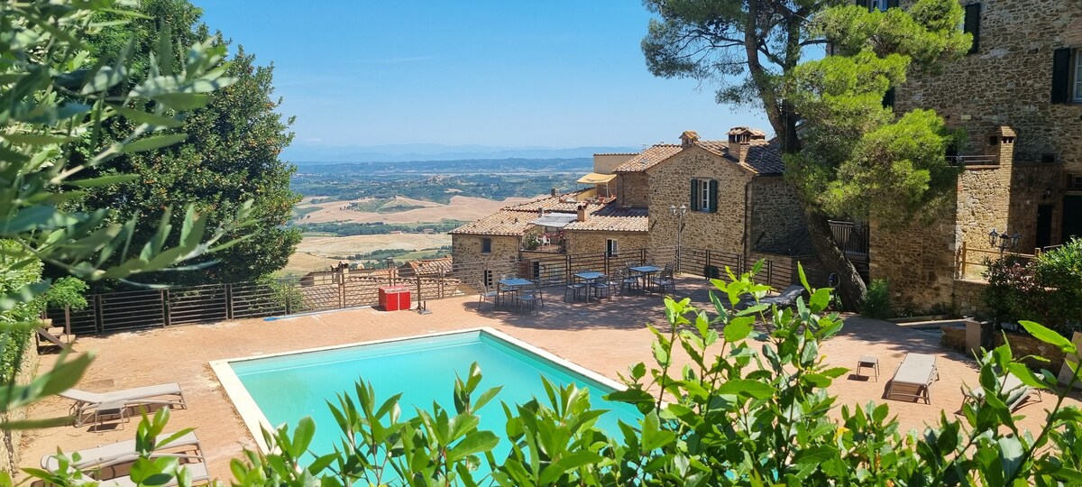 Appartamento ristrutturato di recente in un tipico casolare toscano tra le colline a 20 minuti di macchina dal mare. Ha 2 camere da letto matrimoniali, ingresso accogliente su salone con comodo divanoletto, bagno con doccia e cucina totalmente equipaggiata. Nel giardino di proprietà è situata una piscina (da giugno) e un gazebo in legno con BBQ. L'appartamento è attrezzato per accogliere i piccoli ospiti con lettino, seggiolone, passeggino, scaldabiberon, zainetto per passeggiate. Wifi, TV sat