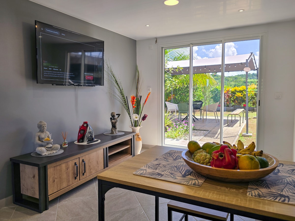 Beautiful apartment with direct access to the beach. Living room with open kitchen leading onto a large terrace with dining table for 6 people, lounge chairs and a seating area. Bedroom with Kingsize Bed with view, bathroom with walk-in-shower and separate toilet. This appartement is accessible to persons with reduced mobility. Located in Schoelcher, close to restaurants, stores and the cinema, you can easily explore the whole island, swim with turtles or simply admire the sunsets.