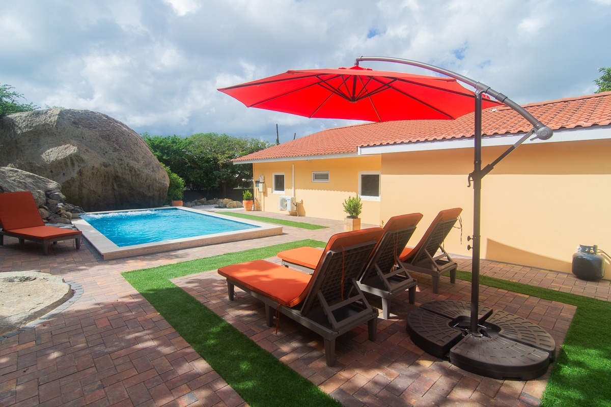 This is a very Cozy, Clean, and Modern place. There is a hot shower. We have a large gazebo with dining table and a grill. It’s located in the middle of the island area Paradera. 7 Minutes from the airport 10 Minutes from Downtown and 12 Minutes from the high rise. There are small supermarkets nearby. We have the option to rent a car with free airport pick up. The place has a beautiful salt water pool with a waterfall that will be cleaned professional twice a week.