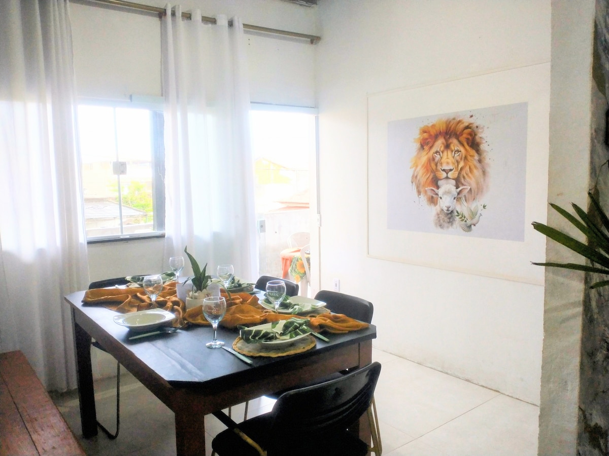 Casa mobiliada, segura e arejada. 2 quartos espaçosos com persianas anti-alérgicas, telas mosquiteiras e grades nas janelas, quintal gramado, churrasqueira, portão automático, interfone, INTERNET 400MB. Quarto I c/ cama Queen Size e split, quarto II com 3 camas de solteiro, ar condicionado. Sala com SmartTV 40"c/IPTV), ventilador teto, ventilador pedestal e sofá, cisterna , caixa d'água com bomba automática. Enxoval e utensílios domésticos completo. Aceitamos Pet de pequeno porte.