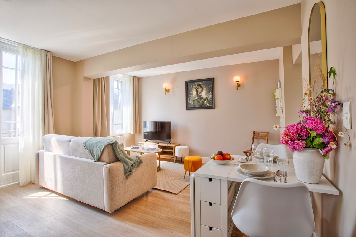 Escape to our radiant duplex apartment located in the heart of Deauville! Fully renovated in November, enjoy this lovely well-equipped 40m² flat boasting 2 en-suite bedrooms and an exquisite living room with open-kitchen & beautiful views. This top-floor very quiet duplex bathes in natural light, offering a peaceful and stylish living space for up to 4 guests. ** Location** Train station: 350m - 4 min walk Place Morny: 230m - 2min walk Beach: 900m - 10 min walk Non-smoking, not animal friendly