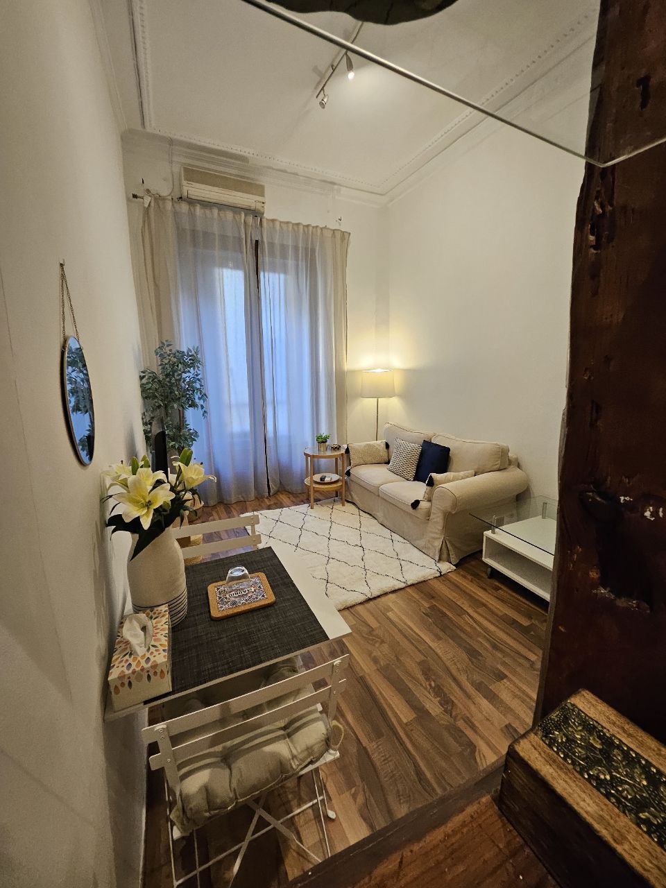 Bright and cozy loft in the heart of Malasaña, one of Madrid’s most vibrant and creative neighborhoods. With 40 m², high ceilings, and exposed wooden beams, it has a warm, character-filled atmosphere. It includes a fully equipped kitchen, living area with sofa, comfortable bed, and a compact bathroom once used during photo sessions. Originally my photography studio, it retains its open layout, artistic spirit, and unique charm, perfect for couples’ getaways.