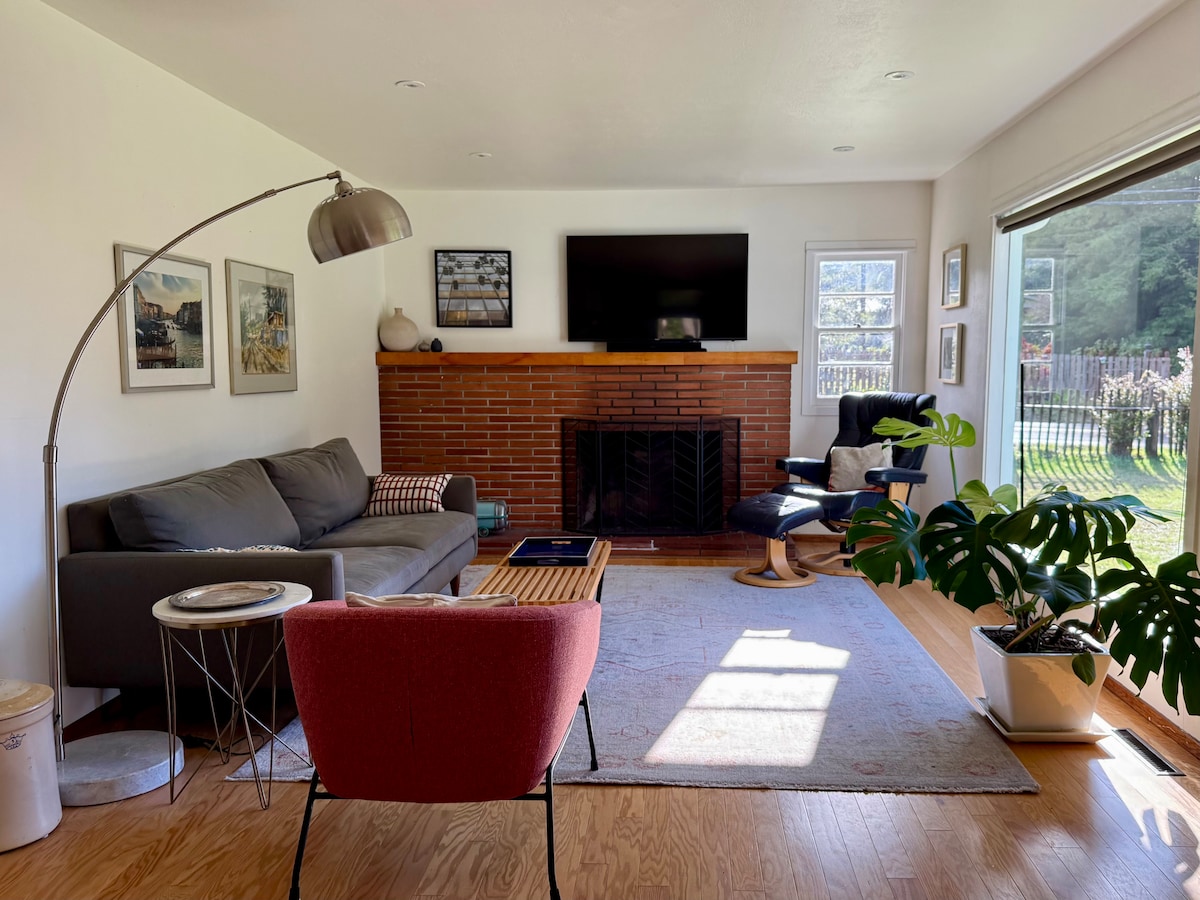 A guest suite downstairs-totally separate from upstairs w/a nice garden outside. You walk down a gravel & brick path to enter @ ground level. It is a large studio w/old growth beams & full length windows, kitchen area, bathroom w/ a jacuzzi tub. There is a Paul Bunyan California King size bed w/ steps, w/no railings. Much room to roam. The outside yard is shared space, yet, we don’t walk in front of your windows & will respect your privacy. There’s a garden & fruit trees to graze in season.