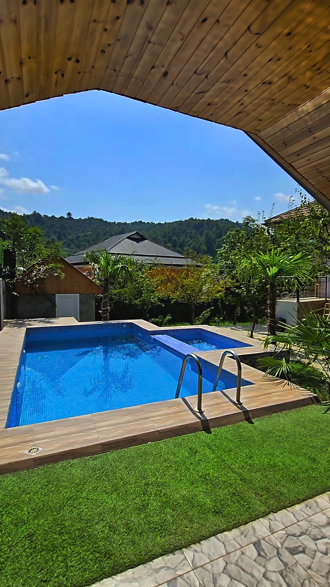 İsti hovuz,dag, meşə mənzərəsi. Əsas yola,çaya,istirahət mərkəzlərinə ,şəlalələr yaxın. Geniş ,səliqəli,rahat və sakit bir məkan. Evdə manqal,samovar ,vifi,smart tv və s. var. Boş vaxtlarımızda çayda balıq tuta bilərsiniz