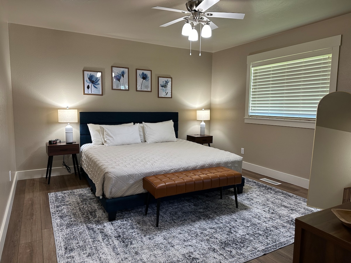 Relax in this peaceful 2 bedroom King/Queen retreat, perfect for couples, families, or business travelers. Enjoy a private enclosed backyard, a dedicated workspace with fast Wi-Fi, and a 2-car garage. Located in a semi-rural setting just minutes from the interstate, restaurants, and local attractions. *Keyless entry *Restaurants/Bowling/Theater/Golf *Fenced backyard/garden with BBQ *Fast Wi-Fi workspace w/monitor *Private garage secure bikes & cars *Central heat/AC *Smart TVs for streaming