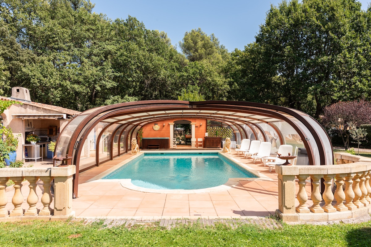T1 neuf de 37 m2 neuf dans un cadre idyllique en Rdc d'une villa familiale au pied des collines de Pagnol. Terrasse de 18 m2 pour vos petits déjeuners au pied du chêne. Piscine semi- privative ( Karin et Marc peuvent y accéder) accessible selon votre jouissance avec barrière de sécurité pour vos enfants sous votre responsabilité. Chambre de 13 m2 avec lit double. Coin Salon avec canapé lit double confortable ouvert sur cuisine équipée. ANIMAUX NON ACCEPTÉS