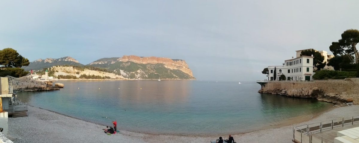Appartement avec superbe vue panoramique sur la mer et les calanques de Cassis jusqu'au Cap Canaille. Emplacement unique vous trouverez à pieds : - à 7mn la plage de l'Arène - à 9mn la plage du Corton - à 15mn le port, le phare, la plage principale ainsi que les commerces du port et du centre de Cassis. Oubliez votre voiture les problèmes de stationnements et de circulations le temps de votre séjour grâce a notre place de parking privée gratuite dans notre résidence surveillée et sécurisée.