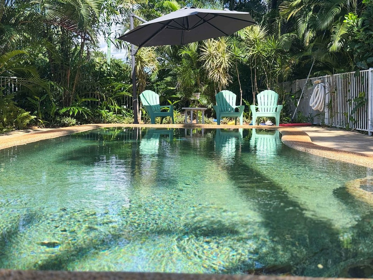 Adjoined by rainforest, our place is handily positioned between beautiful Bingil Bay Beach (200m) and the wonderful Bingil Bay Café (200m). The accommodation is the bottom part of a large Queenslander house with access to the pool and extensive gardens. With its own access and carport you are completely self sufficient but we are available to lend you bicycles or point you to the walking tracks. Be active or do nothing, we are private but not remote.