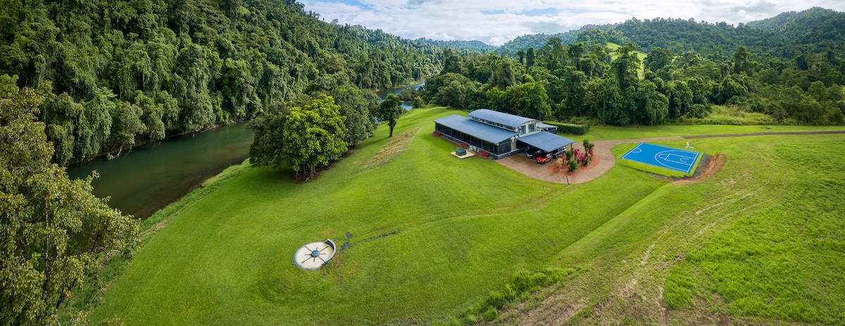 Nestled on three sides by two National Parks, Vanilla Club is a one-of-a-kind organic farm retreat south of Cairns. Cinnamon House at Vanilla Club, a well-appointed five bedroom five bathroom house located directly on a spectacular flowing river, with uninterrupted views of serene rainforest. Dive, snorkel, kite surf, paddle, forage or fish, within 30 min of your new homebase. Or, tell a story by the fire pit, or do absolutely nothing but watch the stars from the hot tub! Enjoy!