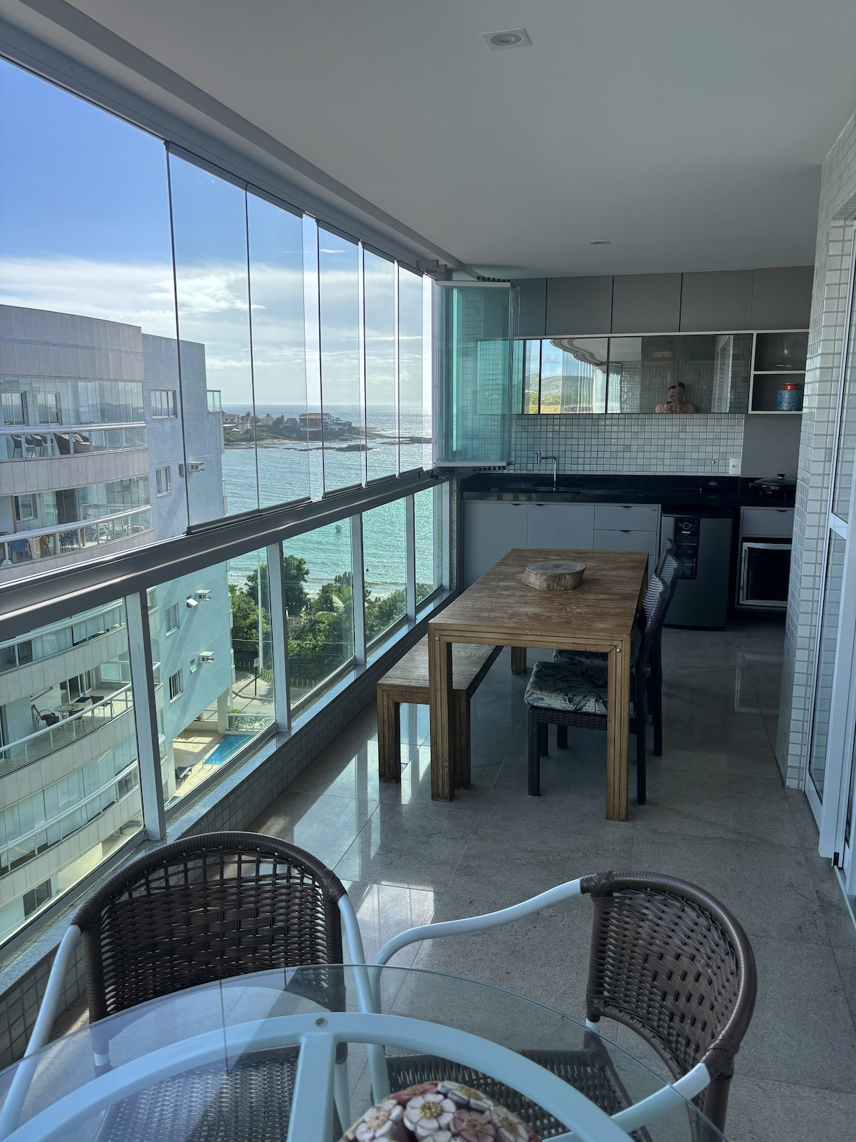 Apartamento muito bem montado e equipado, 100% climatizado, 3 suites com saída para a varanda, 2 suítes com cama de casal, 1 suíte com 2 camas de solteiro e um 1 colchão livre para cada quarto, (até 9 hóspedes), ampla e equipada cozinha, sala de jogos, tv em todos os quartos e sala, salão de festa, cozinha gourmet, piscina adulto/infantil, sauna, academia, jacuzzi, 3 churrasqueiras com cervejeira. Faxineira durante sua hospedagem, em frente a praia de Peracanga, Enseada Azul, Guarapari/ES.