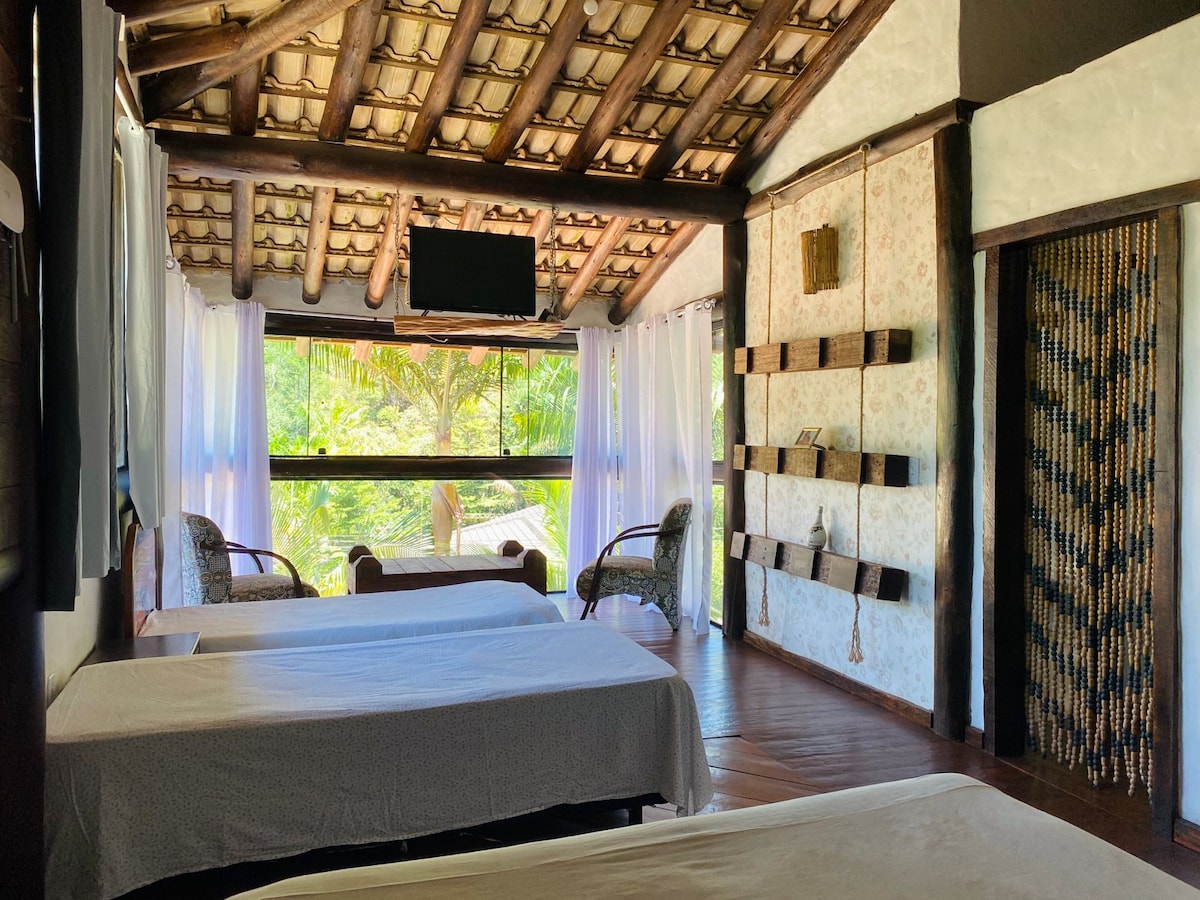 Nosso Bangalo tem duas suítes sendo uma suíte master com cama King size colchão Emma e banheira de hidromassagem ! Nossa segunda suíte possui cama de casal Nossa casa tem cozinha toda equipada , mesa ampla na sala , sofá cama de 3 metros na sala e smart Tv 55 com canais liberados. Na área externa você conta com uma ecosauna. Nosso espaço é todo equipado e pronto para você viver dias extraordinários, cercado de natureza você vai para as praias de Guarapari em 20 min e para a cachoeira em 5 min