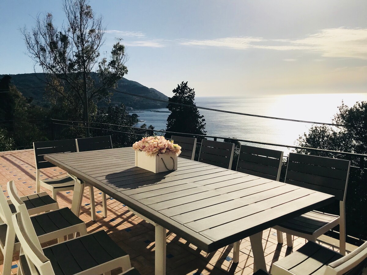 Ampia villa (340mq)in parco privato con vista panoramica sul mare, dedicata a chi ama gli ambienti naturali e silenziosi. Circondata dal verde della collina, dall’azzurro del cielo e da quello del mare.L’arrendamento è semplice e funzionale. In virtù delle sue dimensioni, la casa è ideale per accogliere famiglie numerose o cerchie d’amici.L’ampio terreno che si estende sulle colline, il bel giardino con piscina, terrazza solarium e il balcone con vista sul mare, sono i punti di forza della casa.