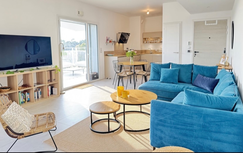 T2 48 m2 + 10m2 terrace (sheltered from wind/rain) on quiet beach on the right bank, on the 1st line. All rooms have sea views. Luxury residence 2015. 2 sheltered/secure parking spaces. Bike storage. Access to the residence is completely secure with videophone, entry code and security guard. Proximity to shops: bakery, butcher, grocery store, tobacco press are 3 minutes' walk away. Port, town center and restaurants are 150-300 m away on foot, along the beach.