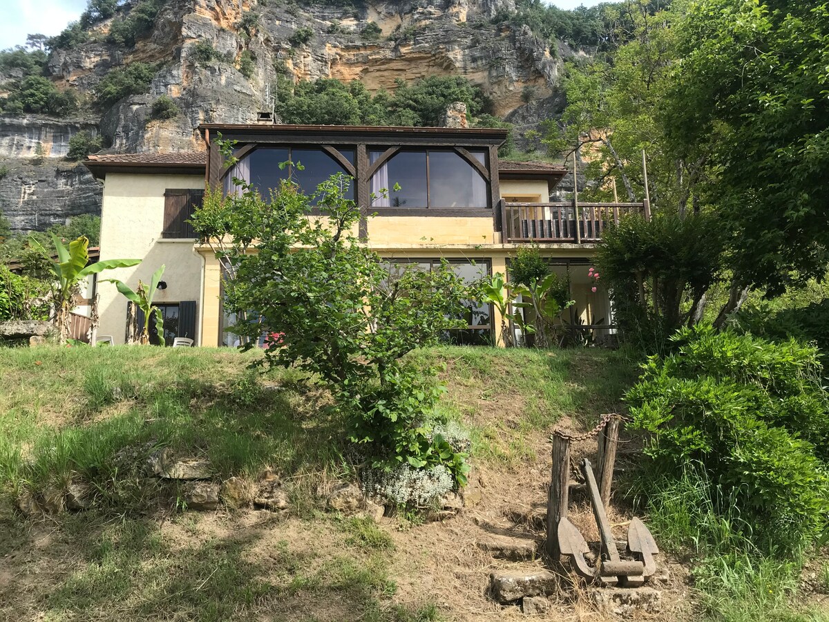 Insolite et coquette, charmante maison adossée à la falaise. Dans une petite ruelle piétonne, juste à côté des jardins tropicaux, au milieu du village de La Roque Gageac. Douceur du climat à tout moment par son exposition plein-sud. Et grâce à la protection de la falaise dont vous retrouverez un morceau dans le salon et la chambre. Très belle vue de la terrasse sur la rivière Dordogne.
