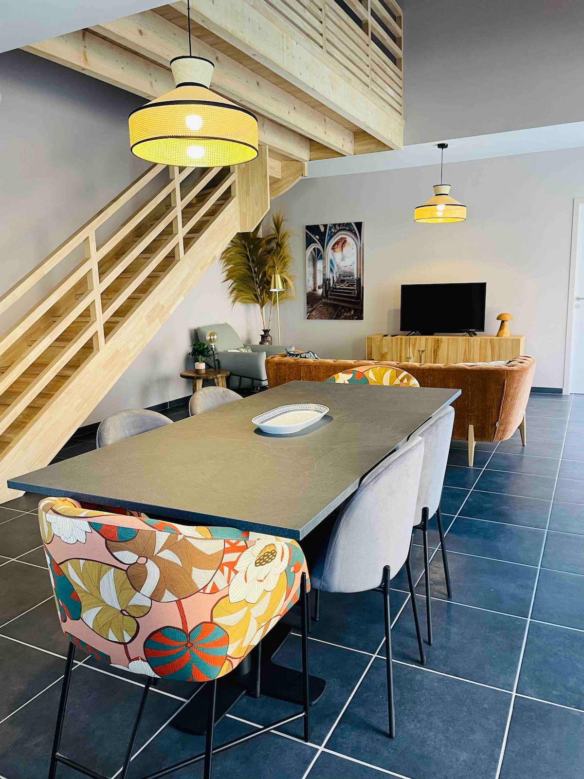 Our modern duplex apartment is a stylish accommodation located in the beautiful Dordogne. It features a tastefully decorated bedroom located on the mezzanine level, providing ample space. Highlights: · Queen bed (160 x 200cm) · 55 m2 · Terrace · Luxury design & amenities · Sofa · Smart TV · Free Super high-speed internet (Starlink) · Fully-equipped open kitchen · Separate Bathroom w/ shower *Not suitable for guests with limited mobility