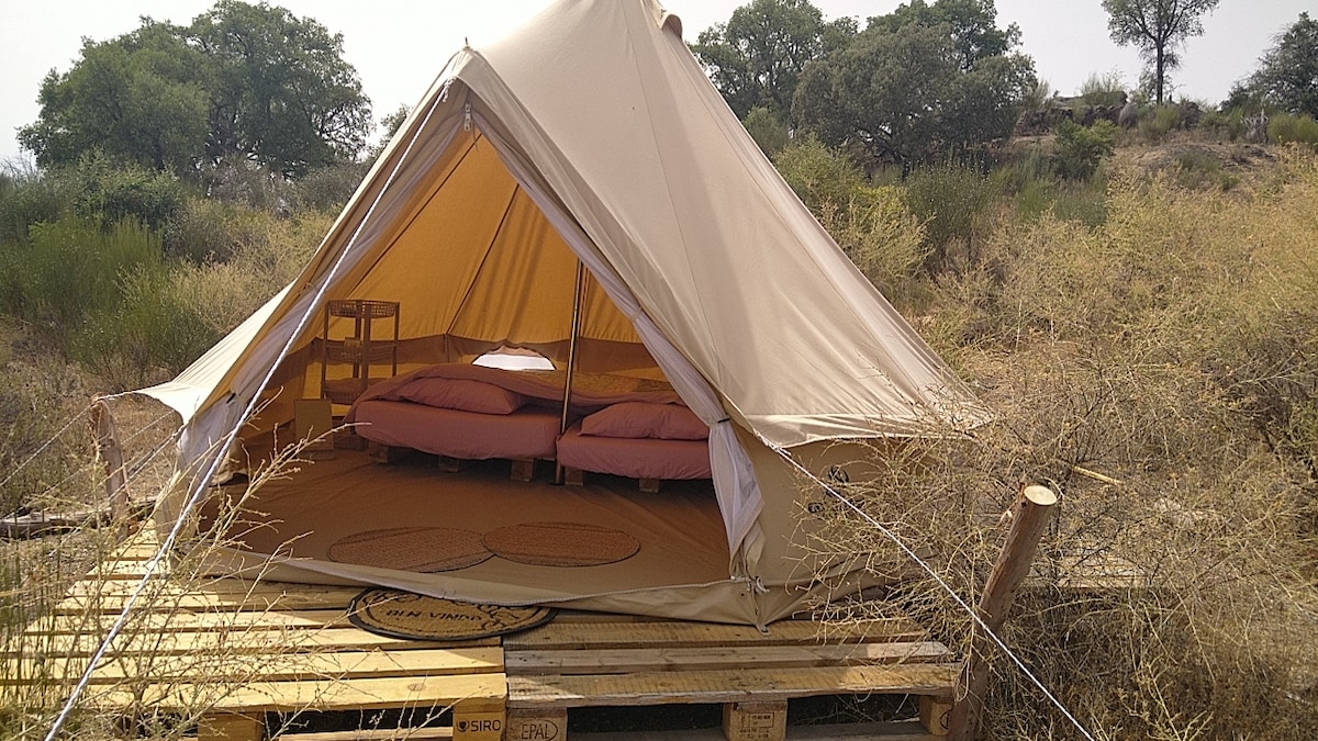 Off-grid nicely decorated Belltent for rent, in the middle of nature between olive- and corktrees, a little paradise. Outside livingroom, with kitchen. Come to rest in the calming environment, good energy, where crickets and frogs sing in the evening. 15 minutes away from Castelo Branco, with nice restaurants , pastelaria's, and historic places. 10 minutes from the lake Marateca, to walk, swim, sup or canoe. Sightings like Serra de Estrela, Gardunha, waterfalls, hiking, forests, <1 hour away