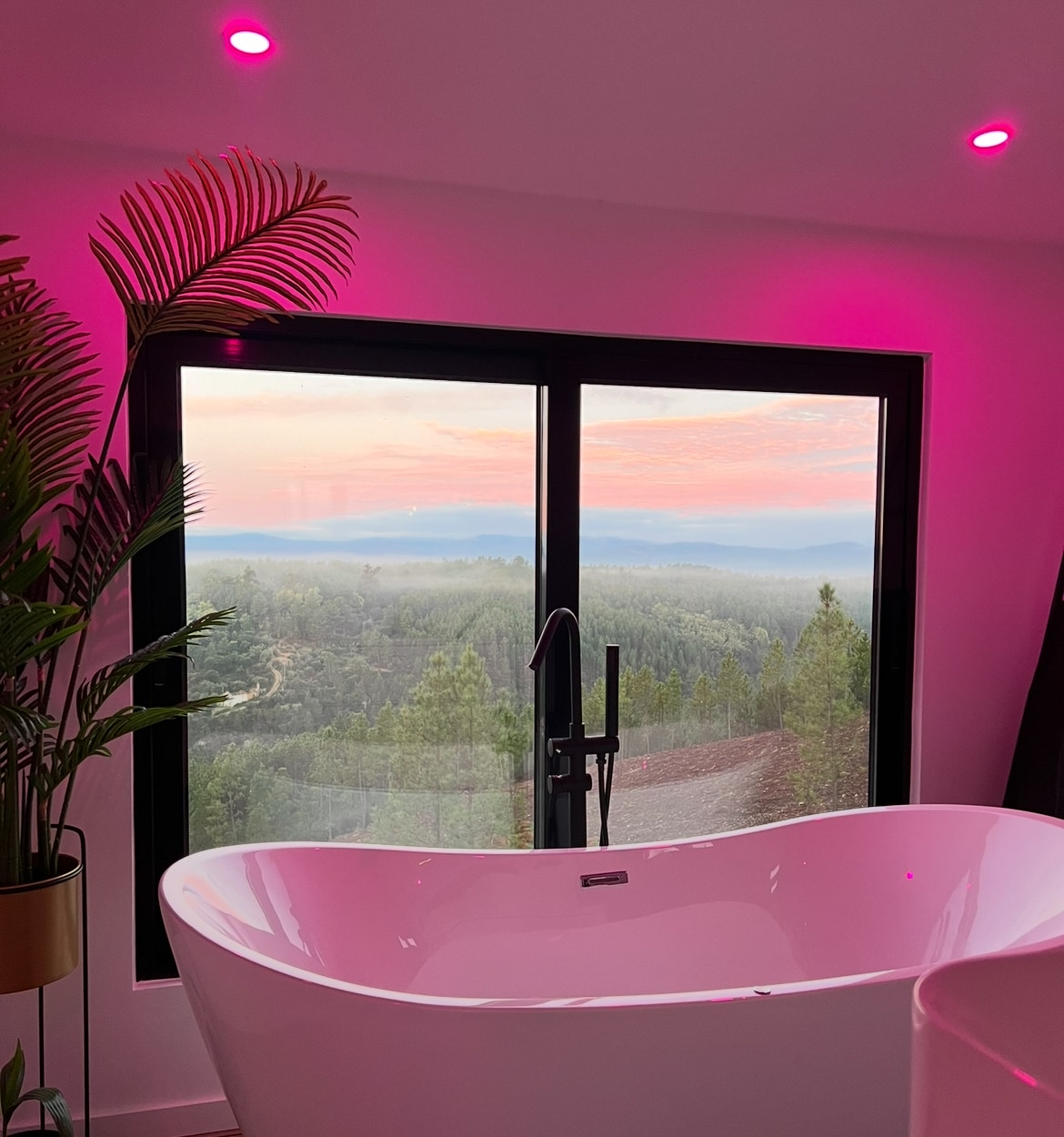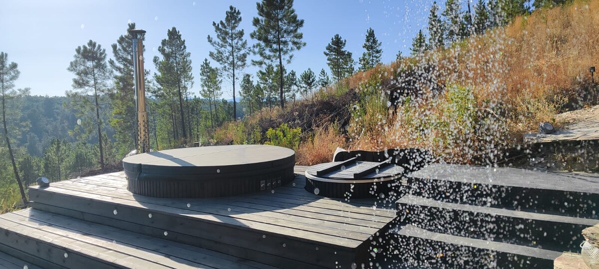 Private hilltop wooden lodge in Malhadil, part of Freedomville. Enjoy full privacy, stunning views, a hot/cool tub, hammocks, rain showers, 2 bedrooms, luxury kitchen & smart TVs. Dining table turns into pool or ping pong table. Optional: Book Spa Boa Vista too so you could stay with up to 10 guests. Perfect for retreats or peaceful getaways with friends and family.
