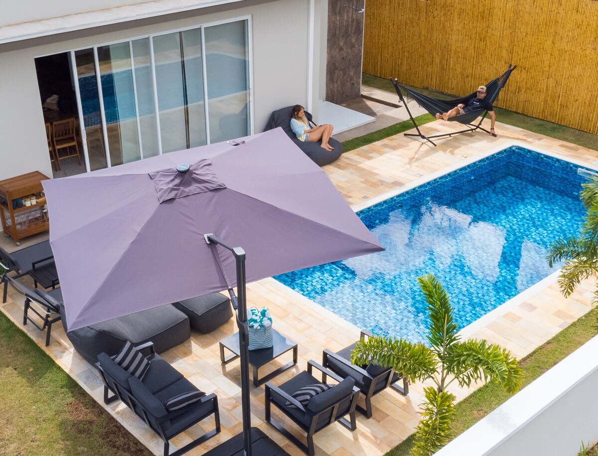 Casa nova, linda e decorada, piscina suspensa (mais segurança para crianças e pets). Em condomínio com segurança 24h. A área conta com 3 quartos, 3 banheiros , 1 cozinha completa, 1 sala, área gourmet equipada com utensílios, 3 TVs (com aplicativos para séries e filmes), eletrodomésticos, lavanderia e um quintal espaçoso com 3 redes disponíveis para relaxar. Todos os quartos possuem ar-condicionado.