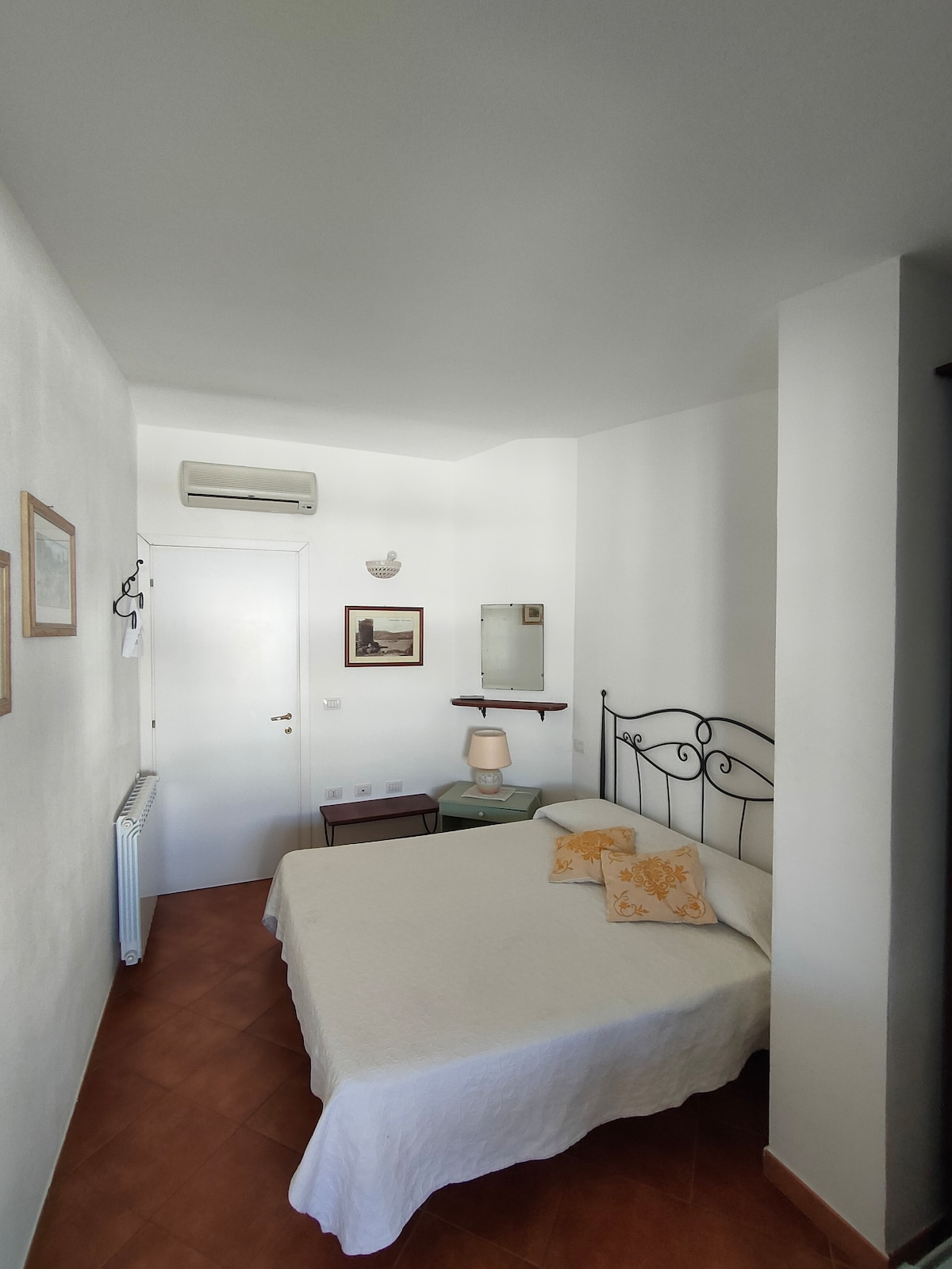 La camera al primo piano di una casa tipica offre un bagno privato con doccia, lavandino, wc e bidet. Dispone di un letto matrimoniale e una poltrona letto, ideale per un bambino fino a 12 anni. La veranda privata coperta, con vista mare, è attrezzata con tavolino e sedie.