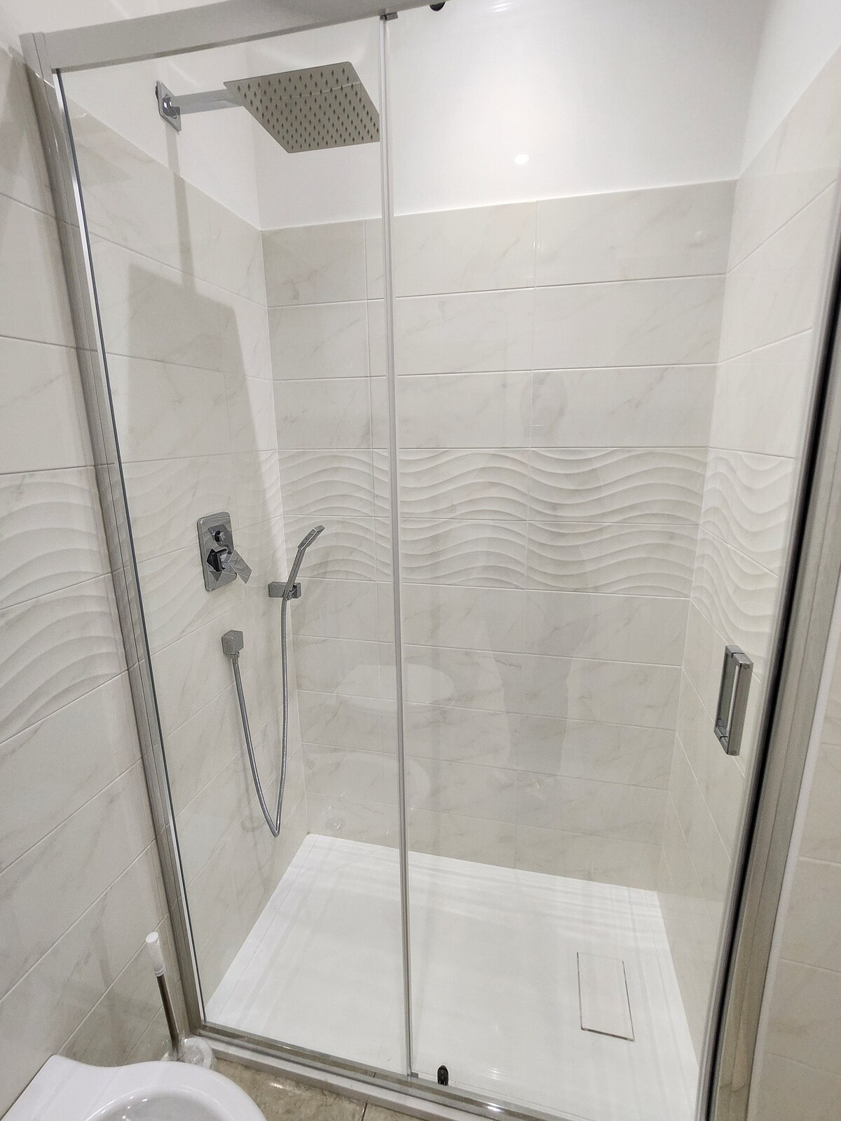 Una camera con 3 posti letto con bagno privato esterno , la porta del bagno fa angolo con quella della camera