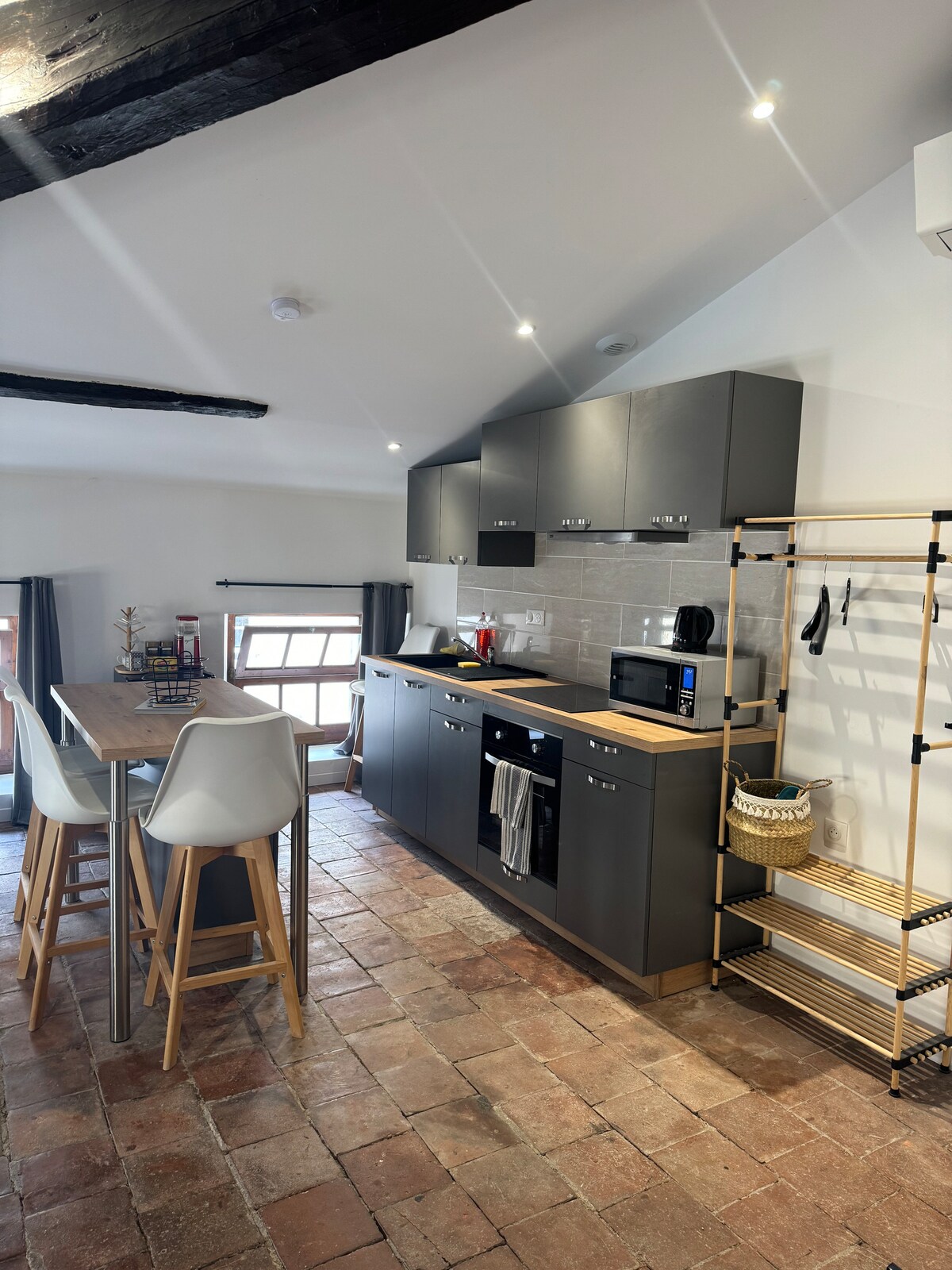 Duplex Cocoon joliment décoré et équipé, avec entrée indépendante Chambre mezzanine avec lit double (literie neuve)/ placard / bureau / penderie / petit meuble de rangement Salon avec TV/WIFI Coin cuisine tout équipé : plaque induction, hotte / four électrique / micro-ondes / vaisselle / Nespresso + dosettes fournies Salle de bain avec sèche-cheveux / gel douche Garage moto sécurisé Logement situé au coeur du village, à proximité des commerces (épicerie, boucherie, restaurant) Proche Montauban