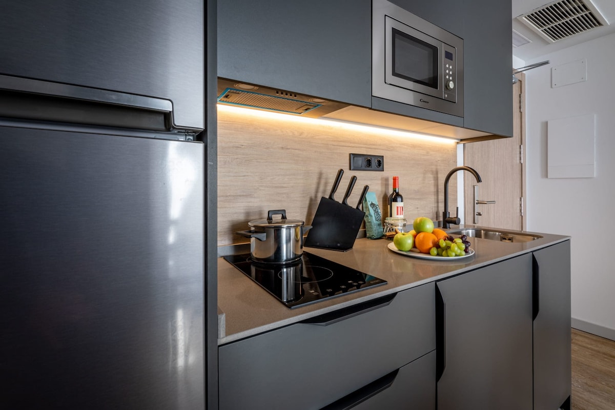 • Studio for up to 2 adults • Queen or double-size bed • Climate-neutral & fully carbon offset • Avg. 19 m2 • City views • Kitchenette • Access to a fully equipped shared kitchen • Access to shared laundry • Air conditioning • Regular professional cleaning • Local gym access included • Yoga mats & online yoga studio access included • Contactless access • Early check-in & late check-out (on request) • Fast WiFi • Smart TV • Free luggage storage • Baby crib available