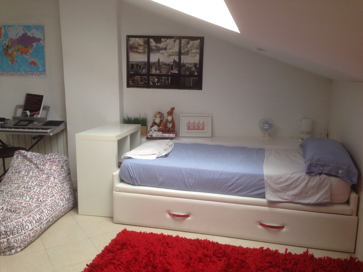 El piso es único por su luz, diseño moderno y su distribución. Perfecto para gente de negocios, pasar el fin de semana, estudiantes, Erasmus, aventureros. Existe la opción de quedarse en una habitación con cama doble u otra con camas separadas. El piso está bien ubicado en el norte de Madrid, a 1 min del autobús, 7 min del metro (Linea 10 Fuencarral), 20 min en metro del centro, 15 min en coche del aeropuerto. Hay muchos bares y restaurantes a buen precio en el barrio donde se come muy bien.